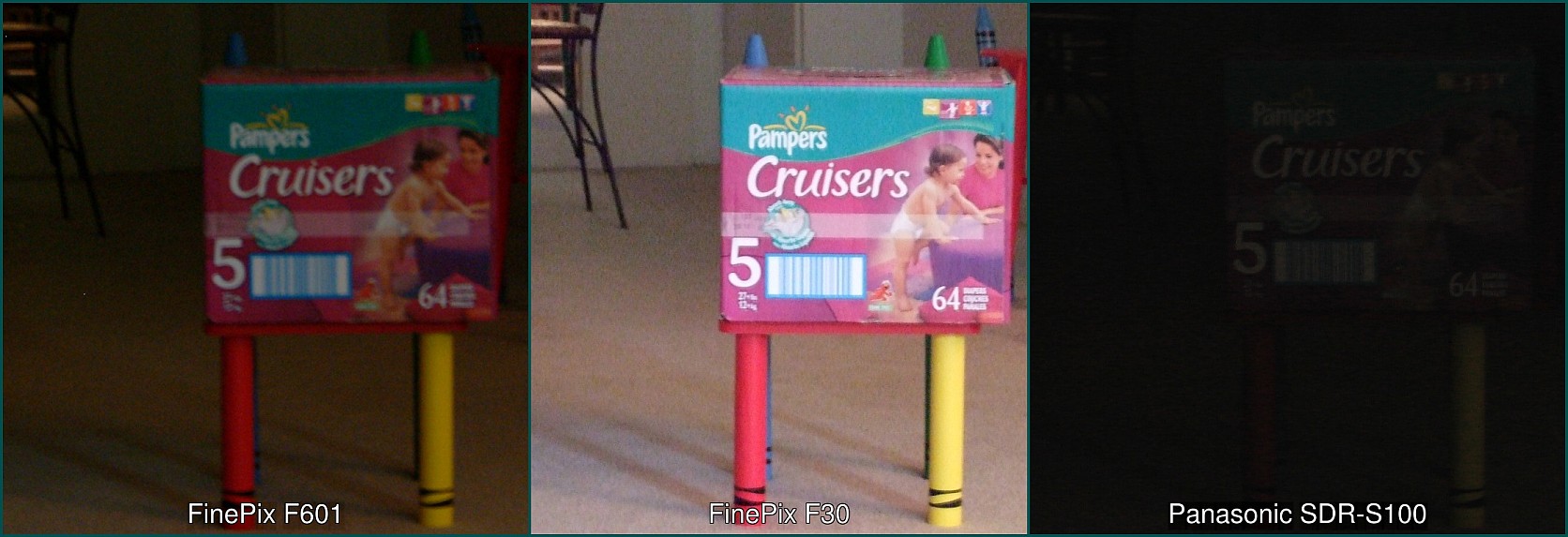 Ten feet away, low room light, 3X zoom, no flash. Note how the background in the F30 shot is much brighter with the higher ISO.